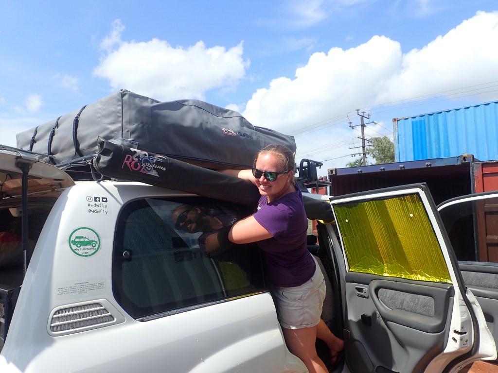 Takes us a good hour to removed the hi-lift jack, sand shovel, recovery box & all its content and then the rooftop tent. Tristan changes his sweat-soaked shirt, not pleasant. The guys at ANL were great, they helped out with the heavy lifting, lashing OHNO to the can and the attention to detail with the paperwork made this entire process very smooth. Thank you, Karen!